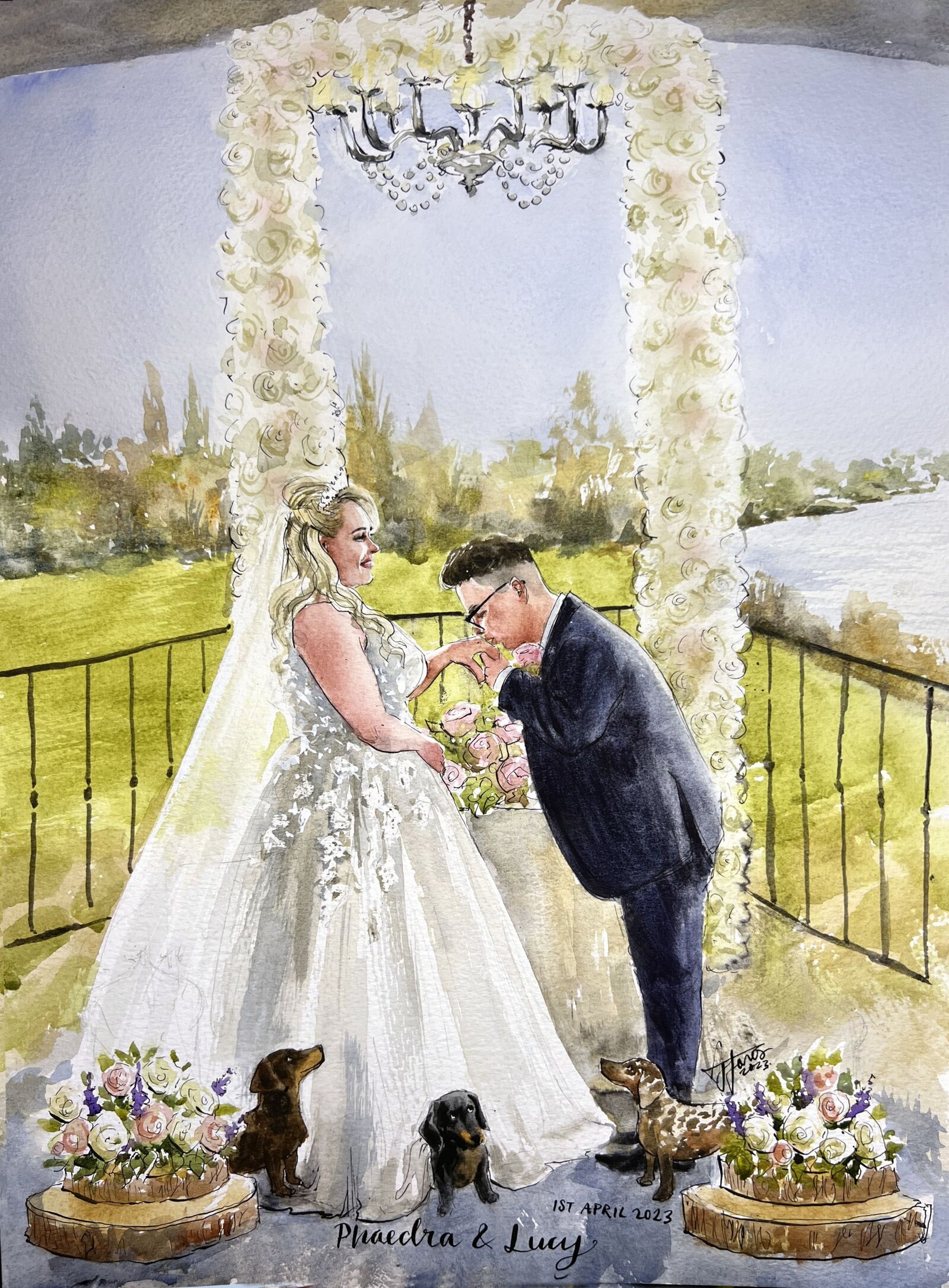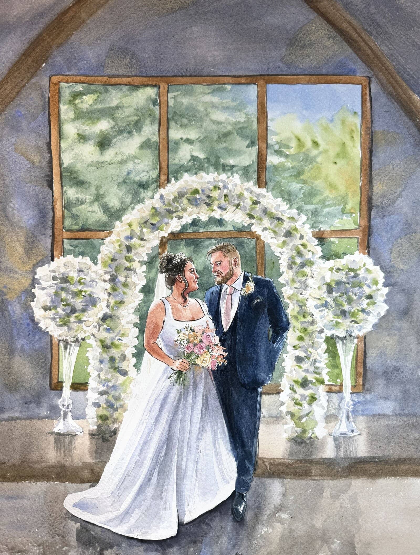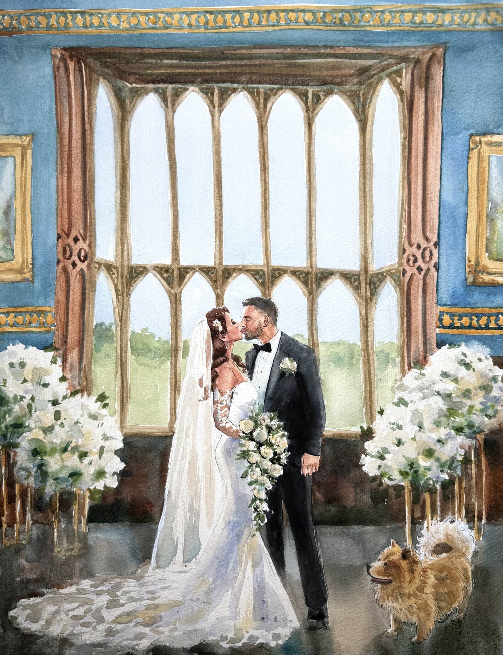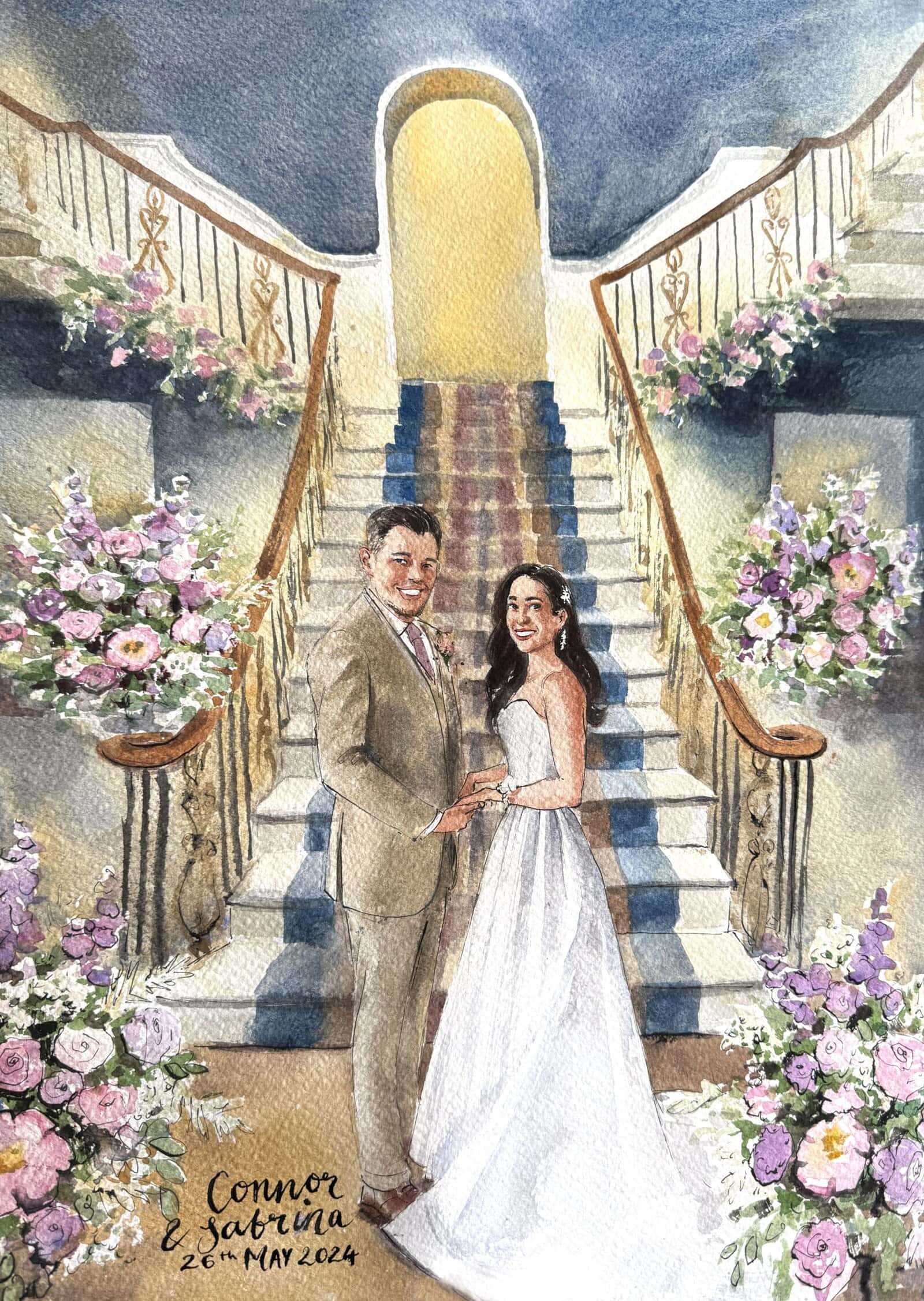 I almost always finish the wedding painting on the day, while your guests enjoy watching the process. With my mixed package, I also add in guest portraits, and if you choose my live package, I may also paint some other scenes.