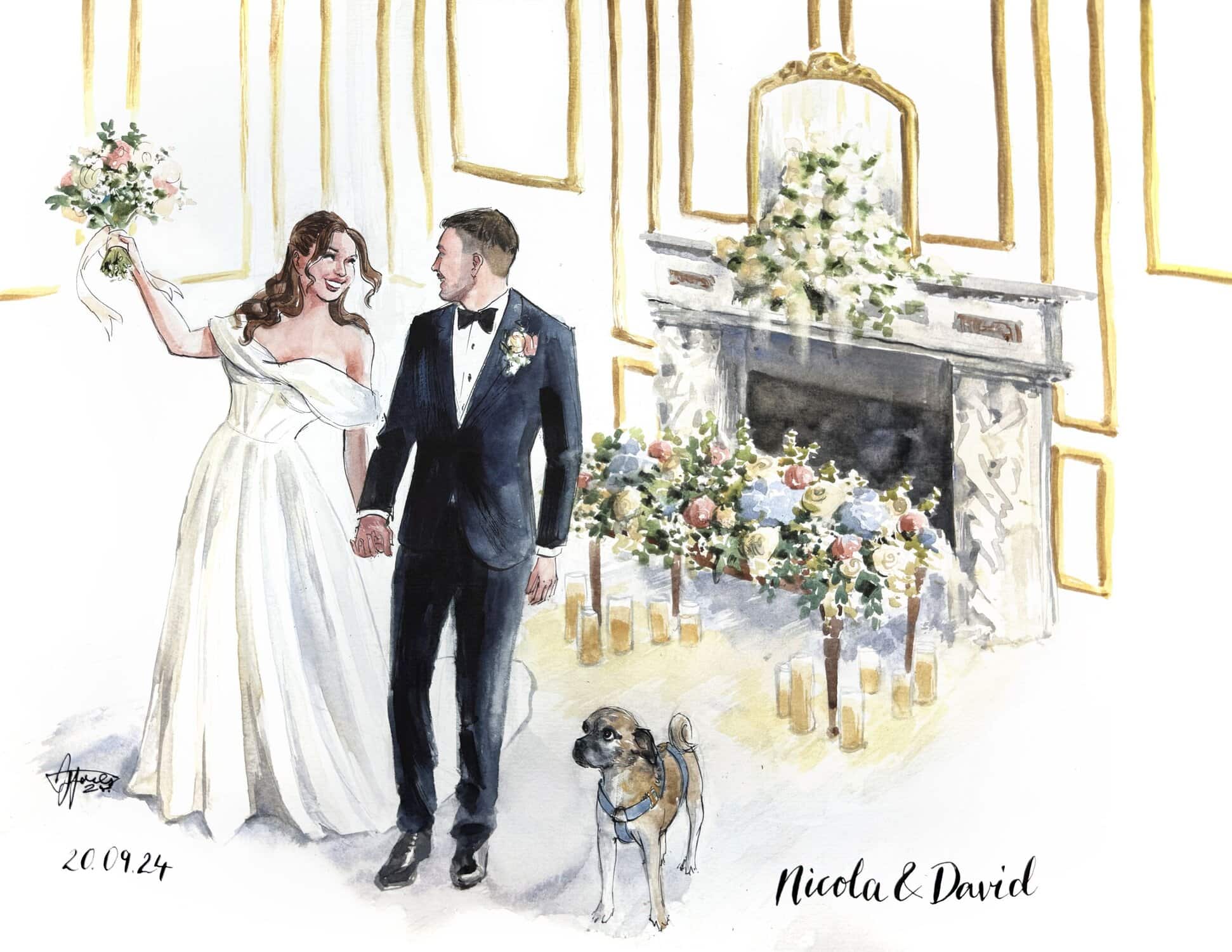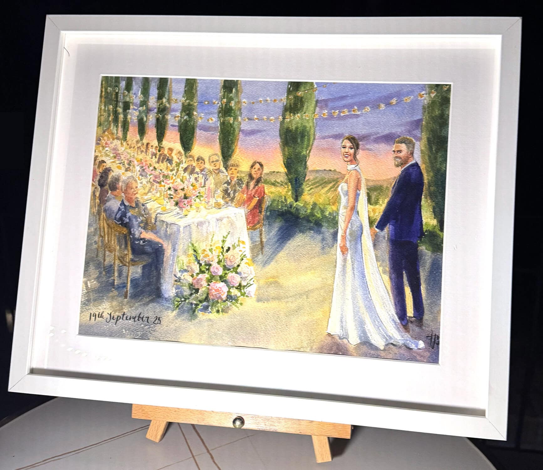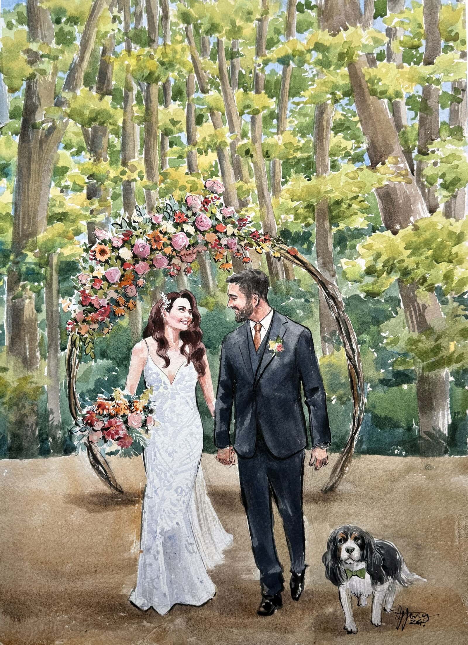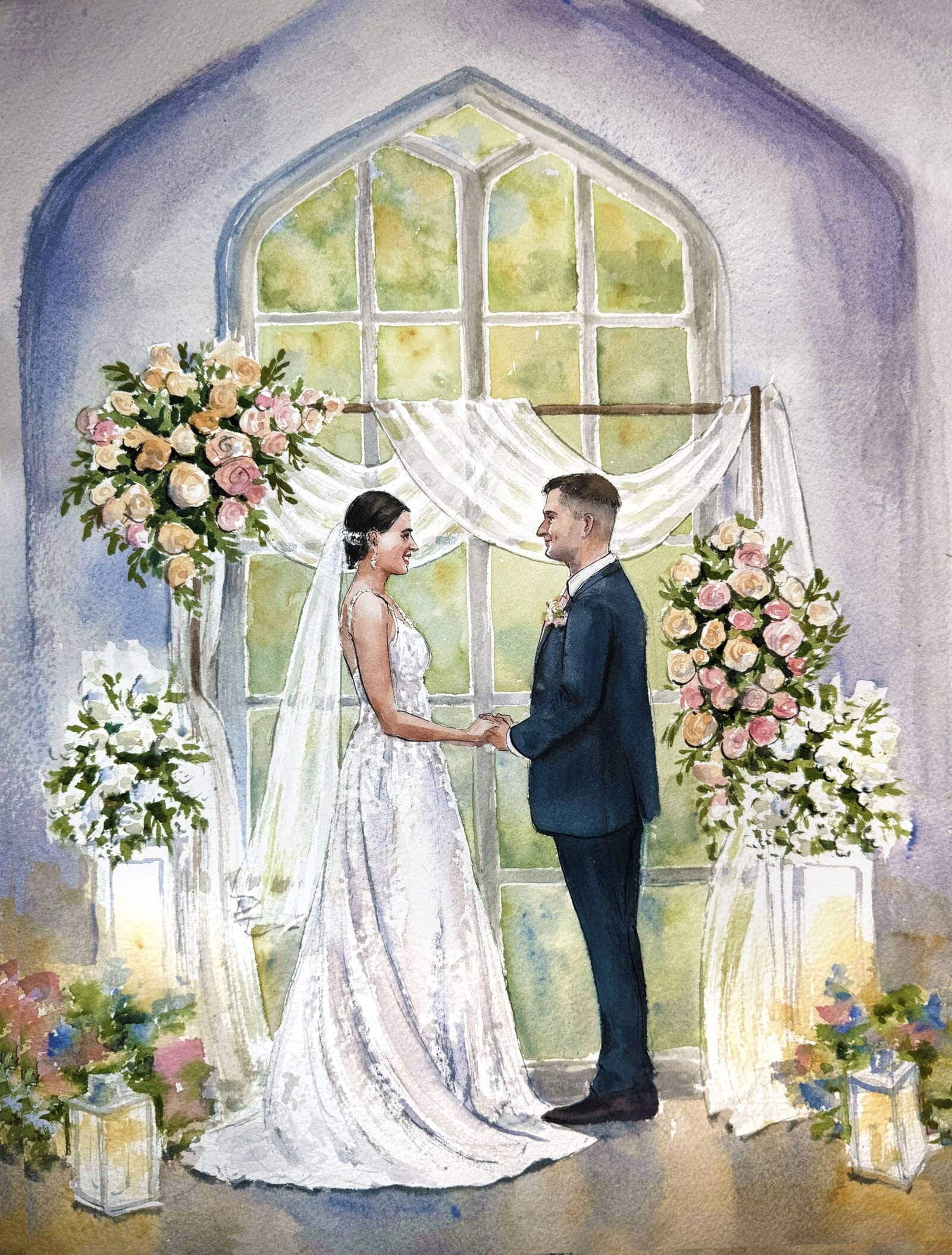 I almost always finish the wedding painting on the day, while your guests enjoy watching the process. With my mixed package, I also add in guest portraits, and if you choose my live package, I may also paint some other scenes.