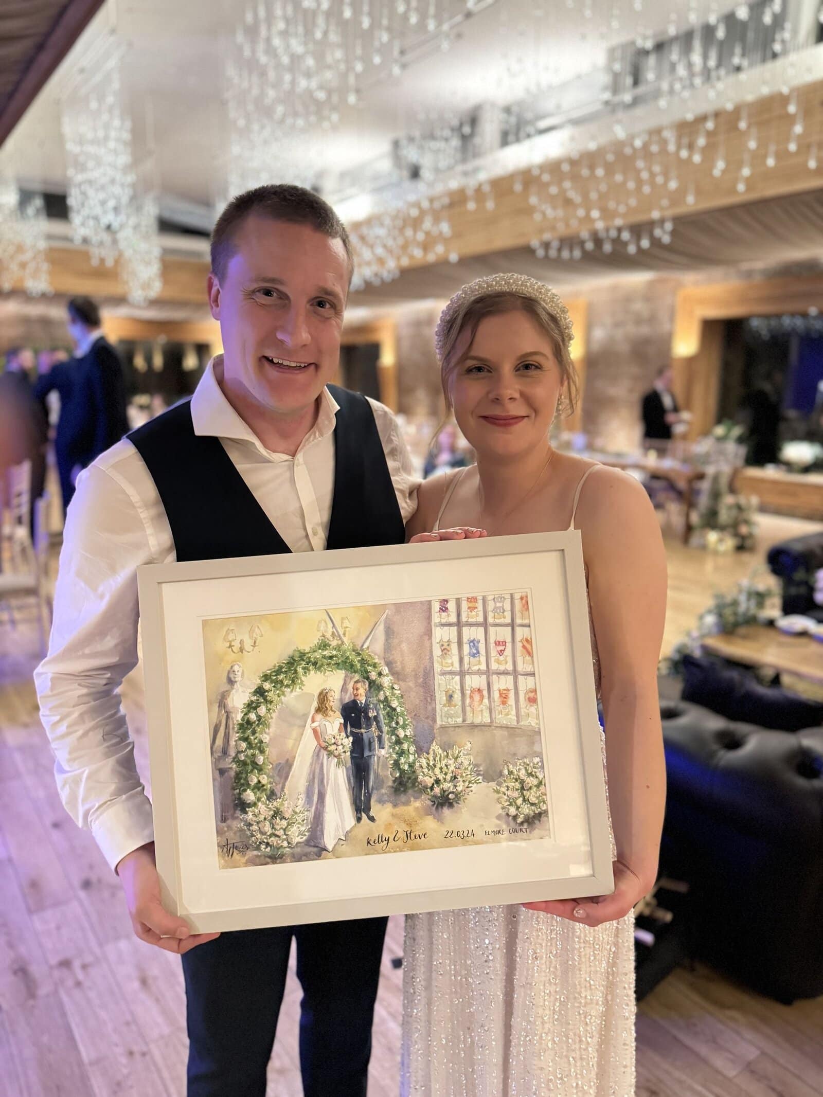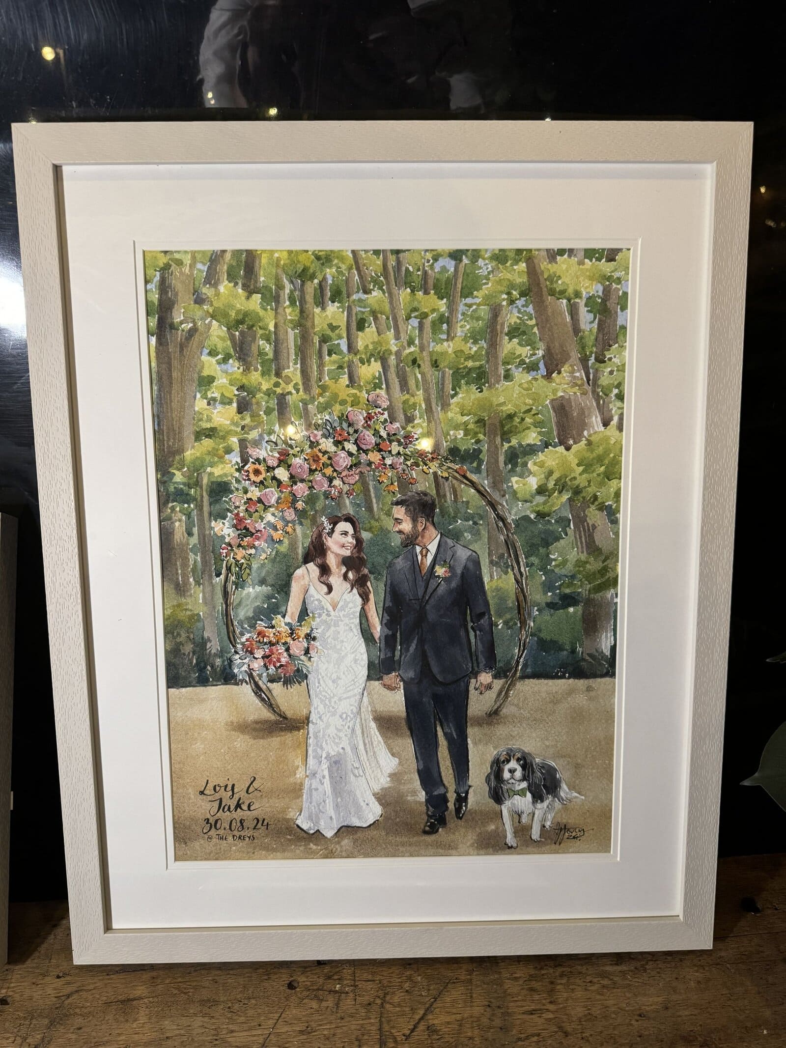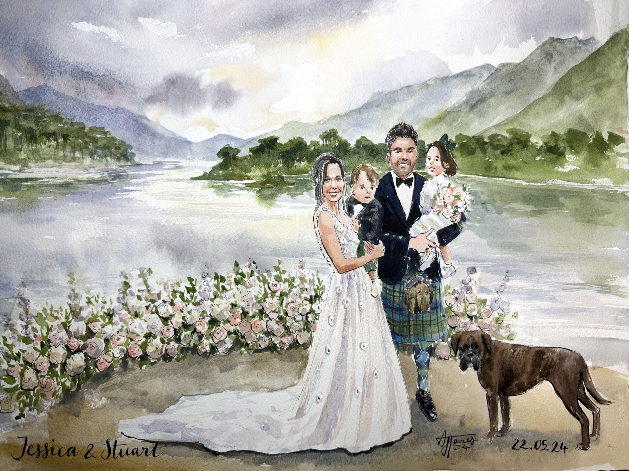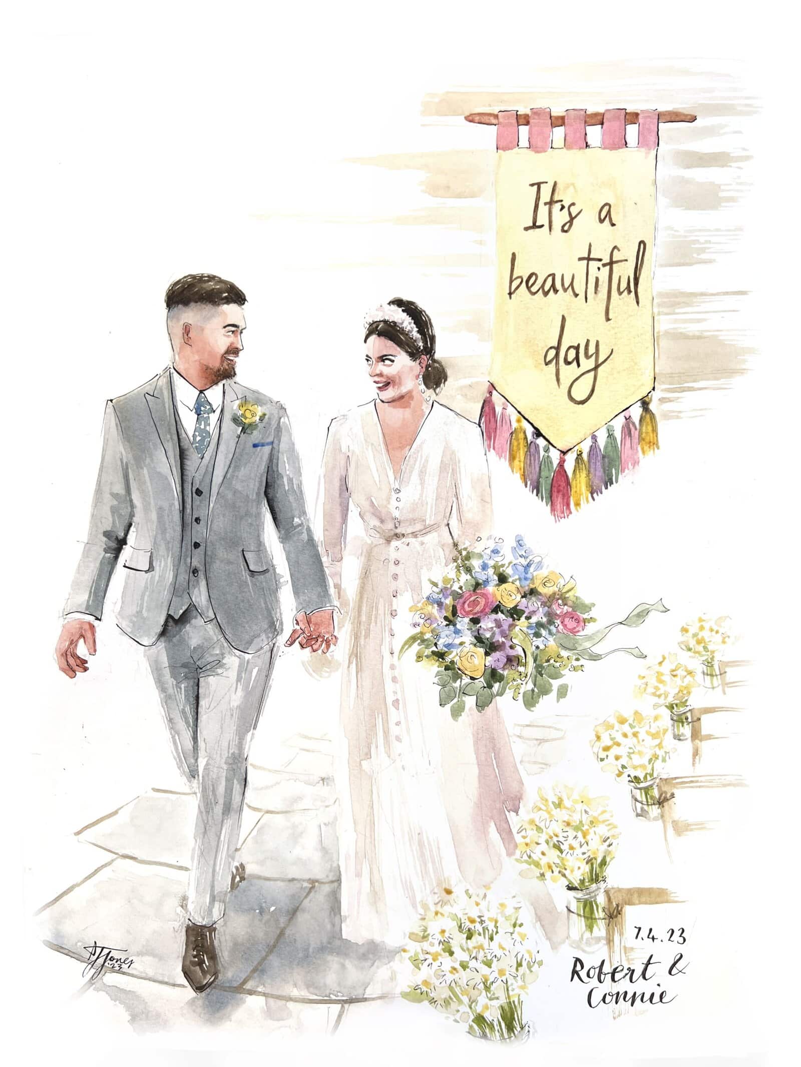 I almost always finish the wedding painting on the day, while your guests enjoy watching the process. With my mixed package, I also add in guest portraits, and if you choose my live package, I may also paint some other scenes.