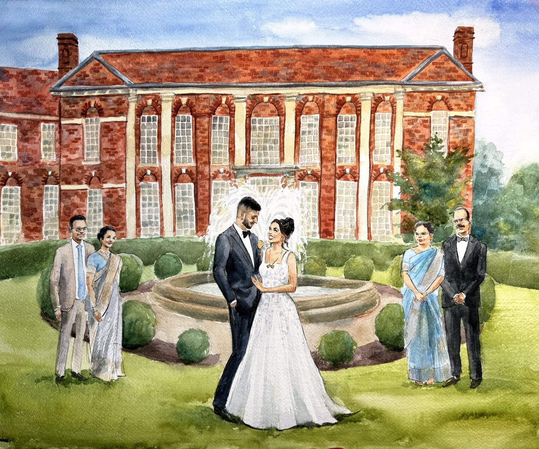 If you’d like portraits of your guests alongside a live wedding painting, you need my Full Day Mixed package! The wedding painting I offer with this service is an A3 size watercolour.