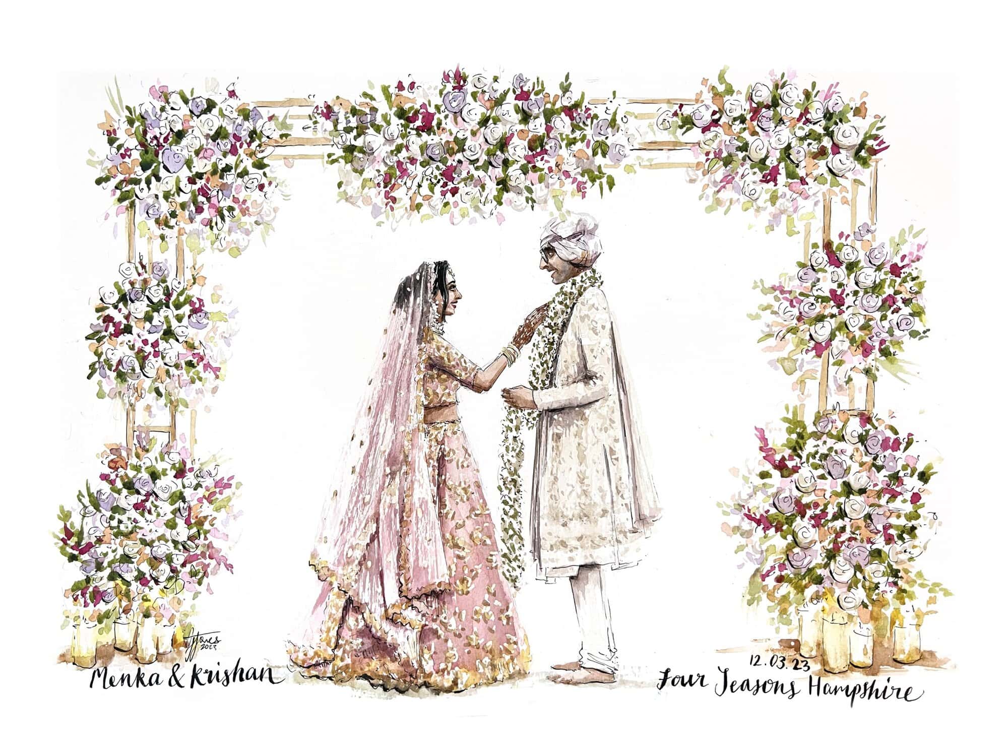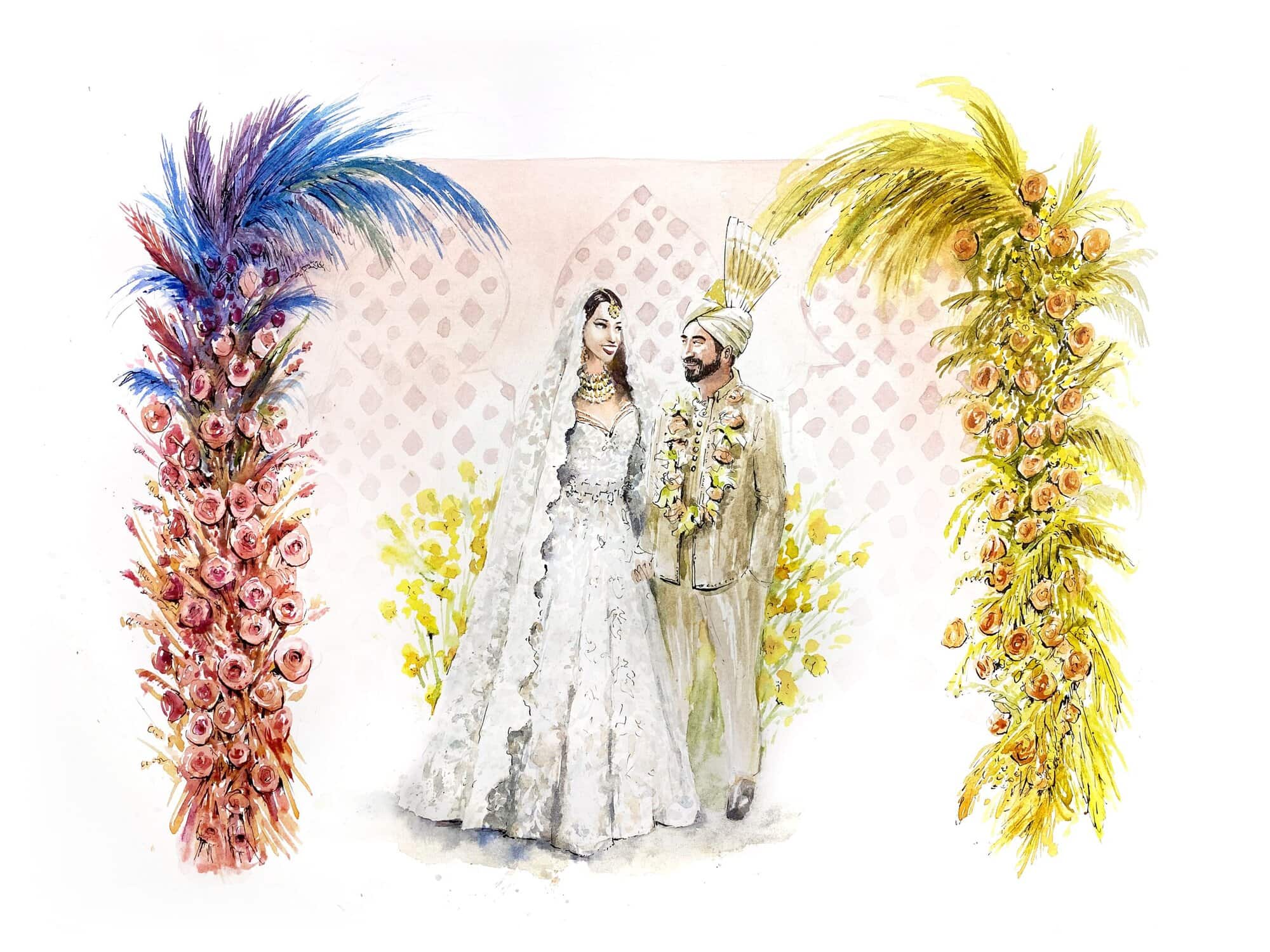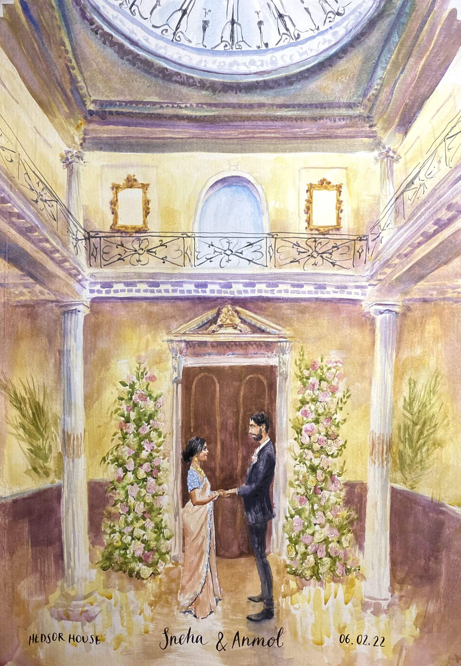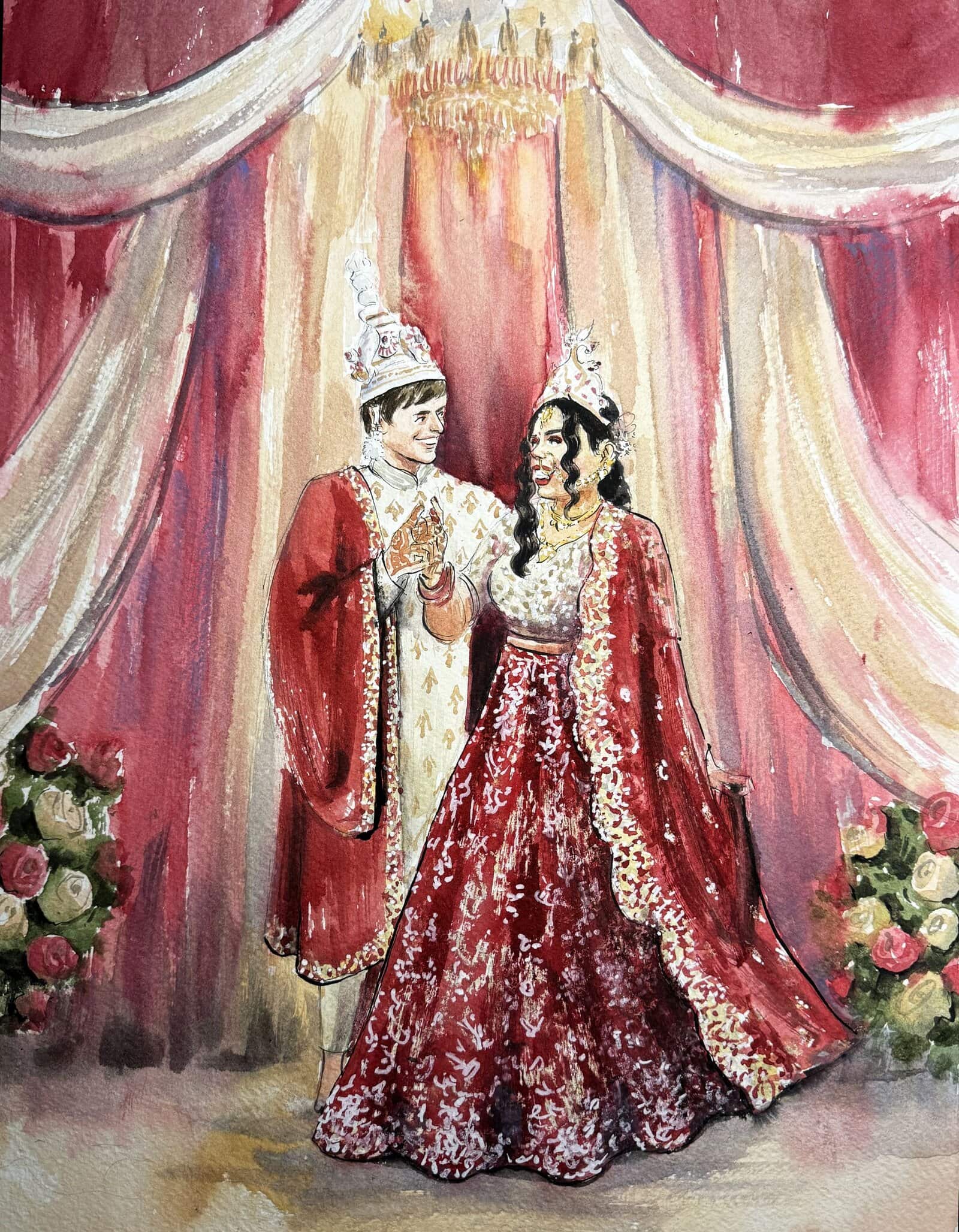 I’ll arrive a few hours before your ceremony, so that by the time guests arrive, there will already be an intriguing painted depiction of your background setting, wether that be a garden, a mandap or a dancefloor. As the ceremony begins, I’ll quietly sketch and take reference photos, finding the best angles to create a beautiful portrayal of you both.