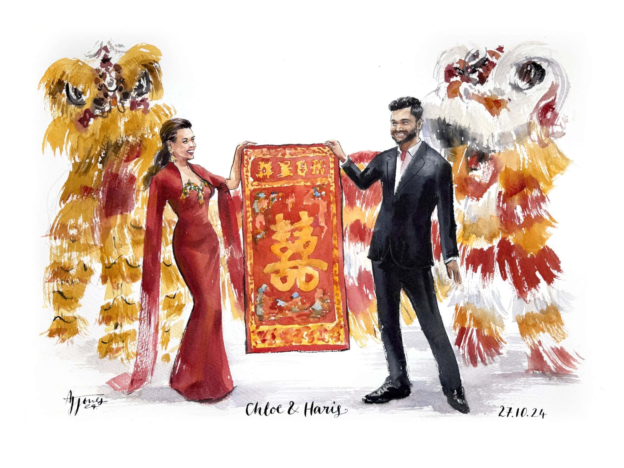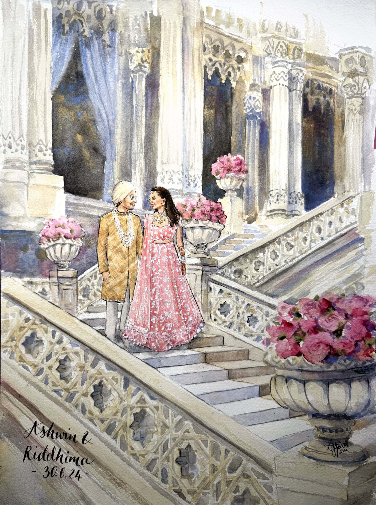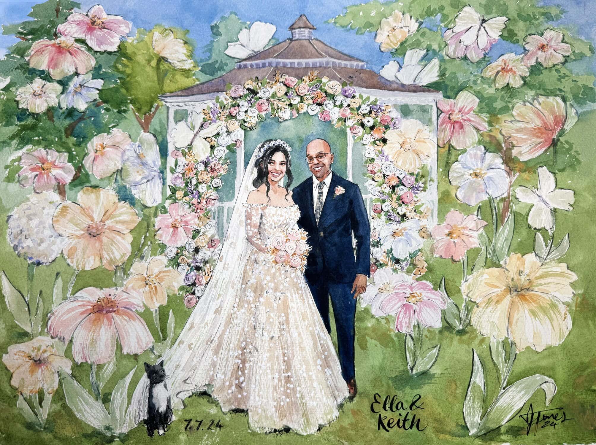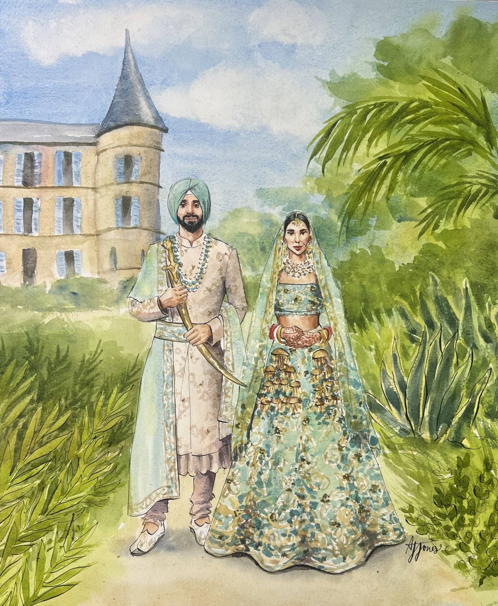 I’ll arrive a few hours before your ceremony, so that by the time guests arrive, there will already be an intriguing painted depiction of your background setting, wether that be a garden, a mandap or a dancefloor. As the ceremony begins, I’ll quietly sketch and take reference photos, finding the best angles to create a beautiful portrayal of you both.